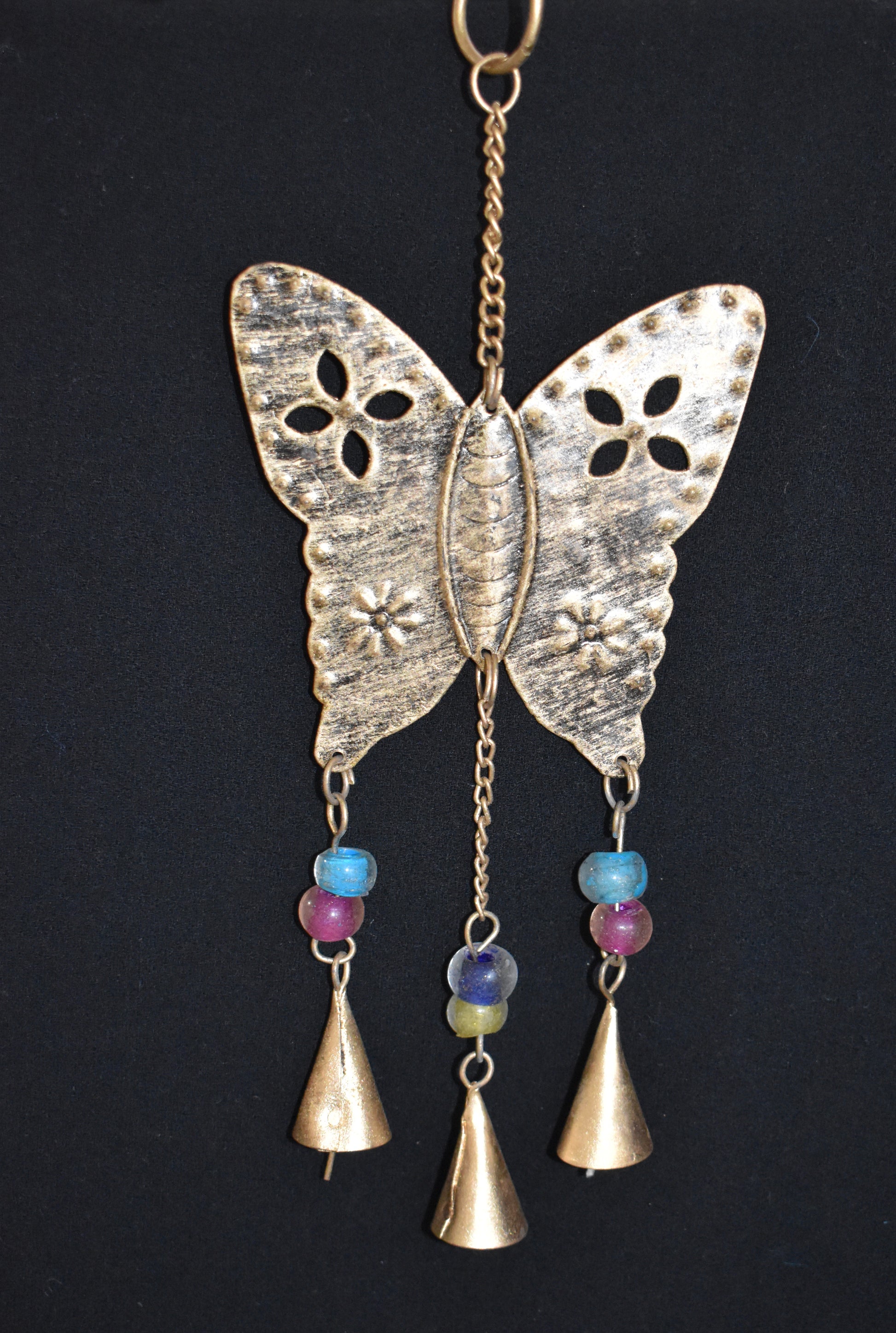 Bring a touch of peace and charm to your space with our hanging butterflies! Crafted from recycled metal and hand painted with rustic gold, copper or silver colour, each piece is full of character. Hung from a chain, with three lower hanging glass beads and bells, these versatile decorations work beautifully as a wind chime or simply as a striking decorative feature in a house or garden.