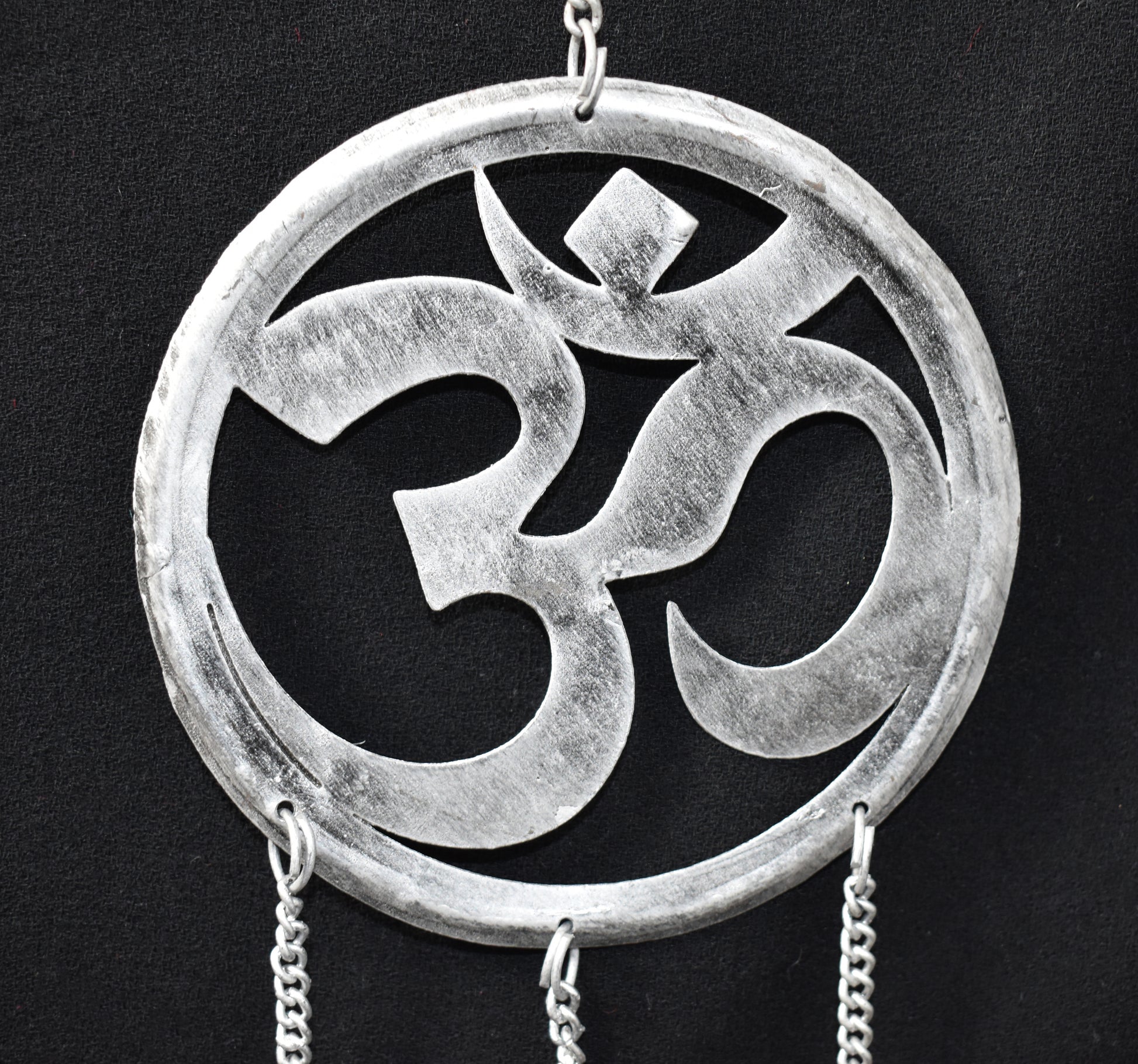 Bring a touch of peace and charm to your space with our hanging Om! Crafted from recycled metal and hand painted with rustic gold, copper or silver colour, each piece is full of character. Hung from a chain, with three lower hanging glass beads and bells, these versatile decorations work beautifully as a wind chime or simply as a striking decorative feature in a house or garden. The symbol Om is considered the first vibration of the universe — the sound from which all other sounds and creation emerged. A sacred symbol in Hinduism and Buddhism.