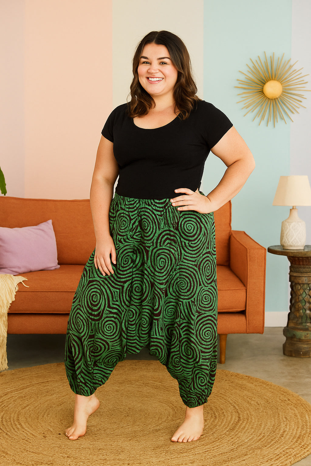 These trousers are available in seven colours and one size suggest best for anyone 8 - 16 or with a waist max 36" (91cm). The waistband is elasticated with a draw cord and there is a hip pocket. The model is a curvy 16/18.