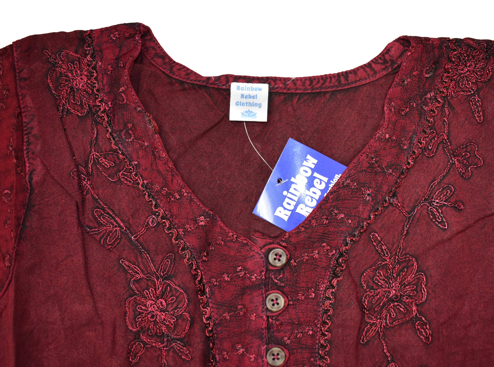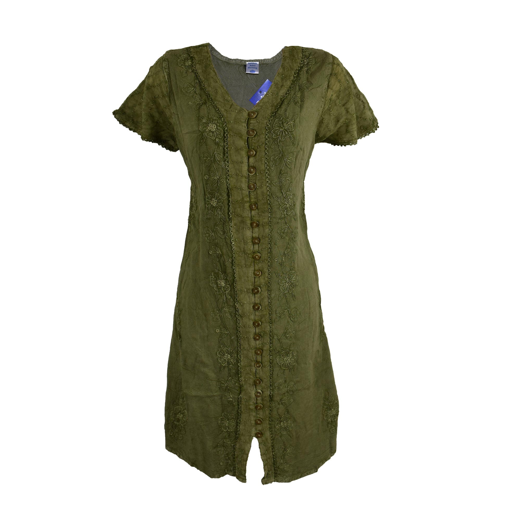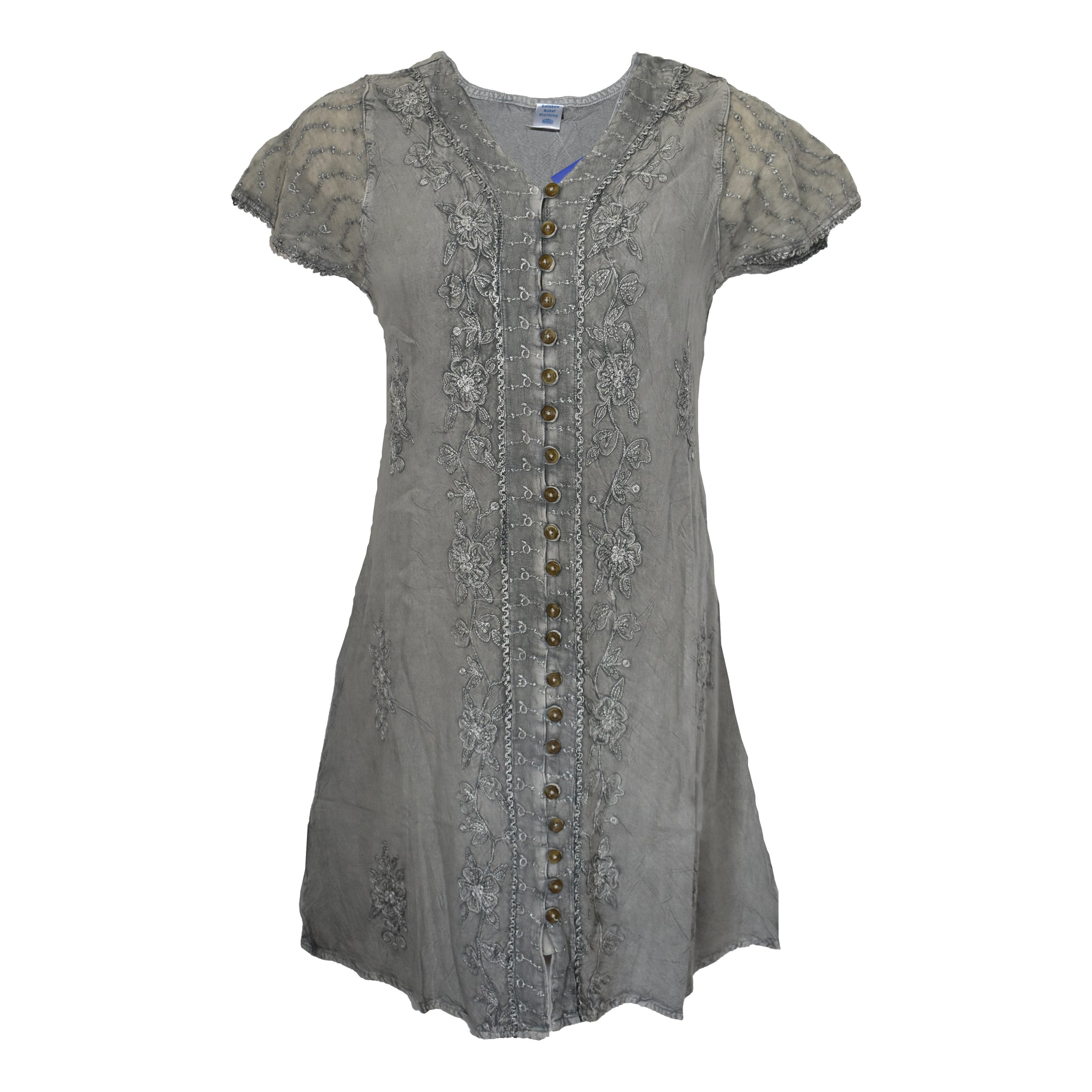 Made from soft viscose, these dresses feature delicate embroidered floral designs on the front and pretty lace-trimmed capped sleeves. The front buttons add a touch of detail, while the back ties allow you to adjust the fit for a more flattering shape.