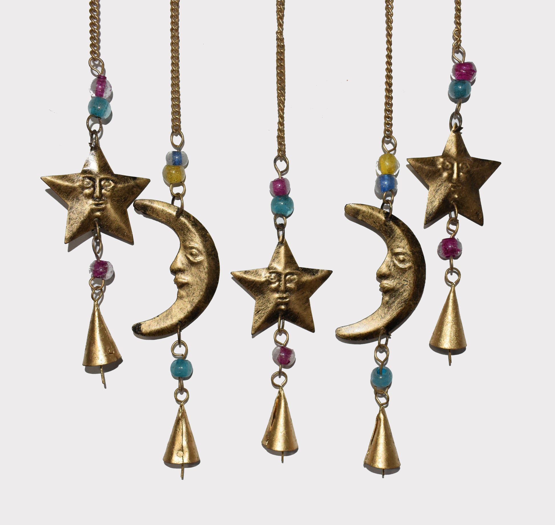Crafted from recycled metal and hand finished with rustic gold colour, each piece is full of character. Hung from a chain, with four lower hanging sun and moons, these versatile decorations work beautifully as a wind chime or simply as a striking decorative feature.