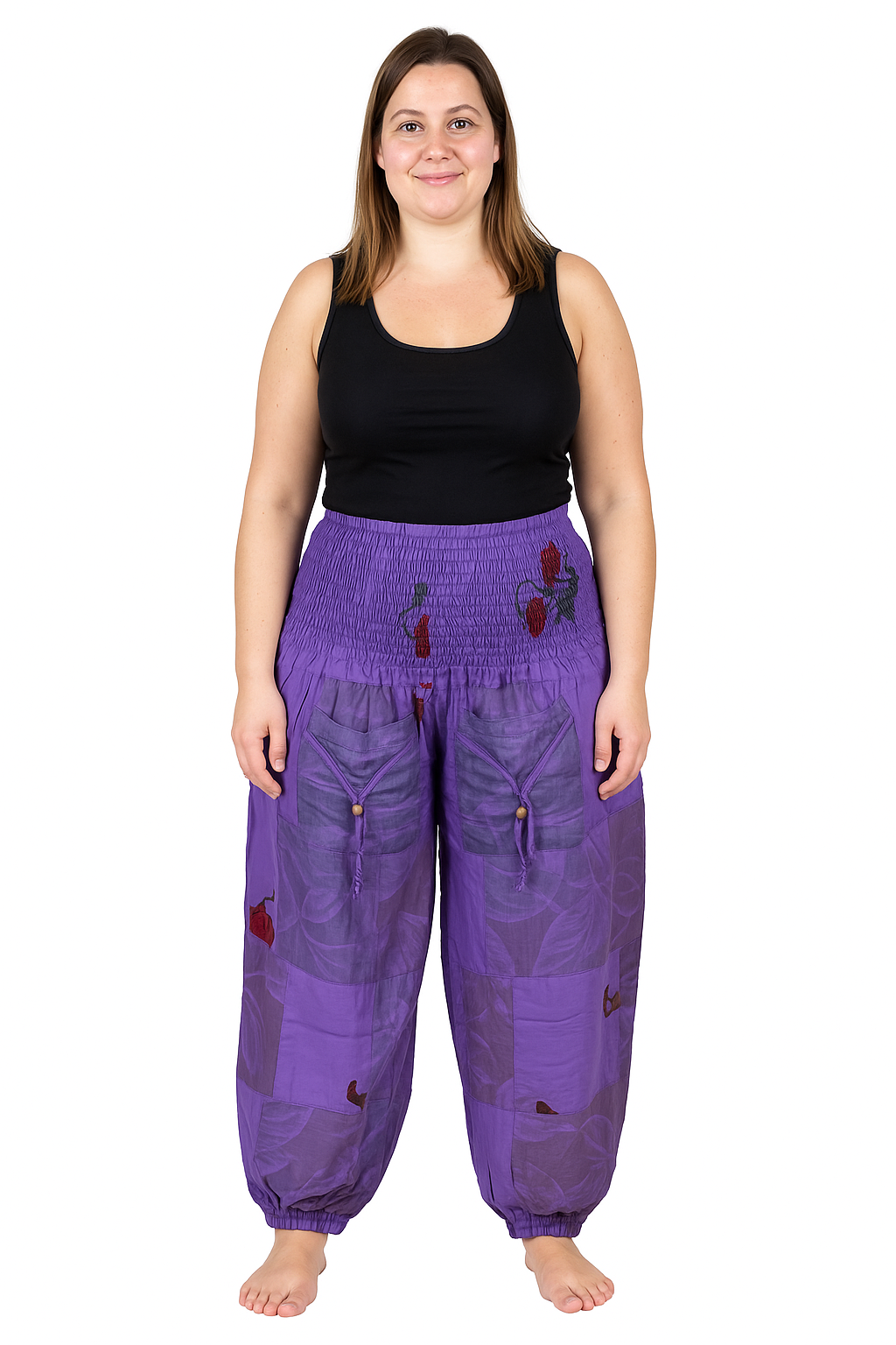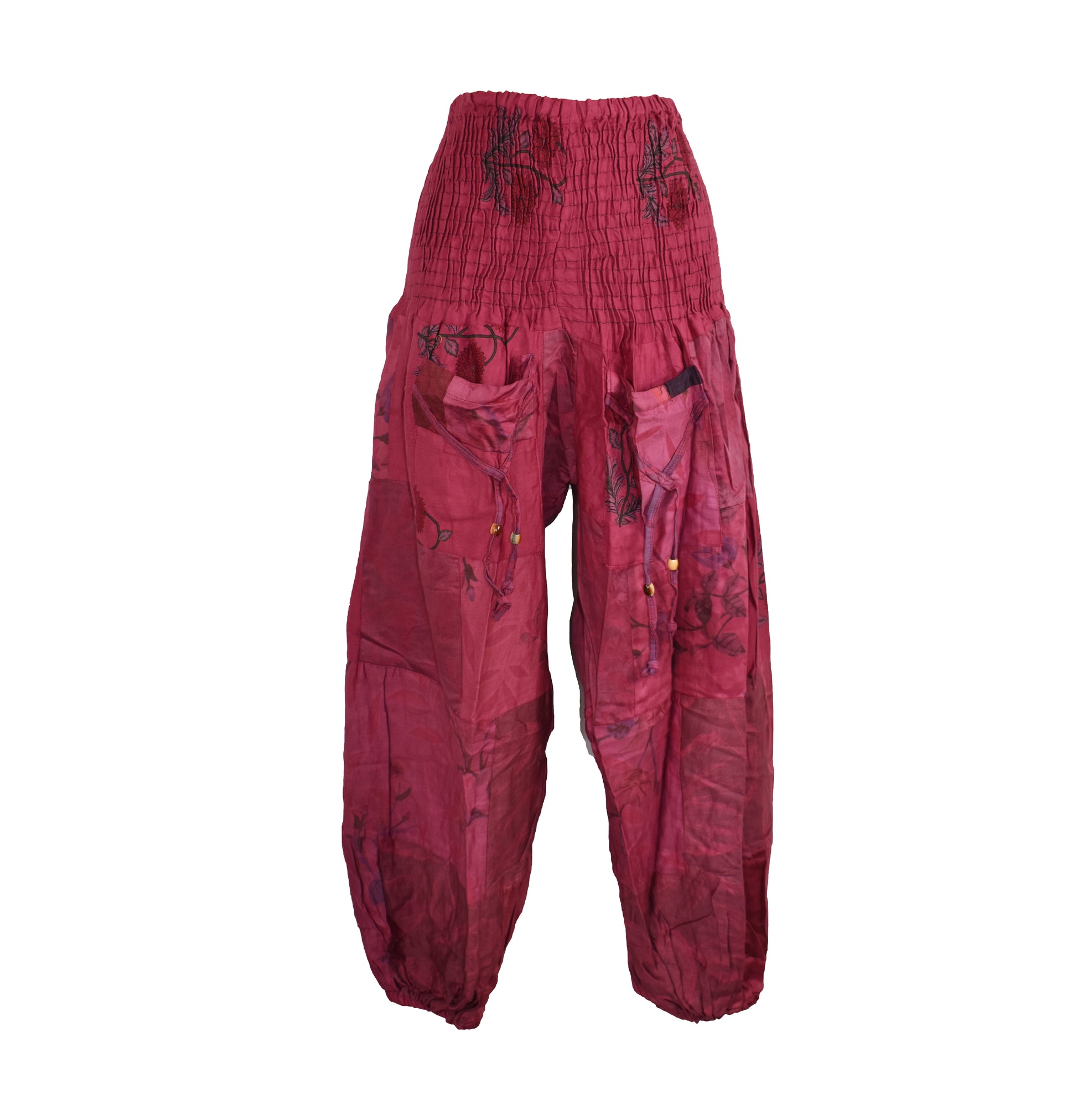 Patchwork Cotton Shirred Waist Harem Trousers
