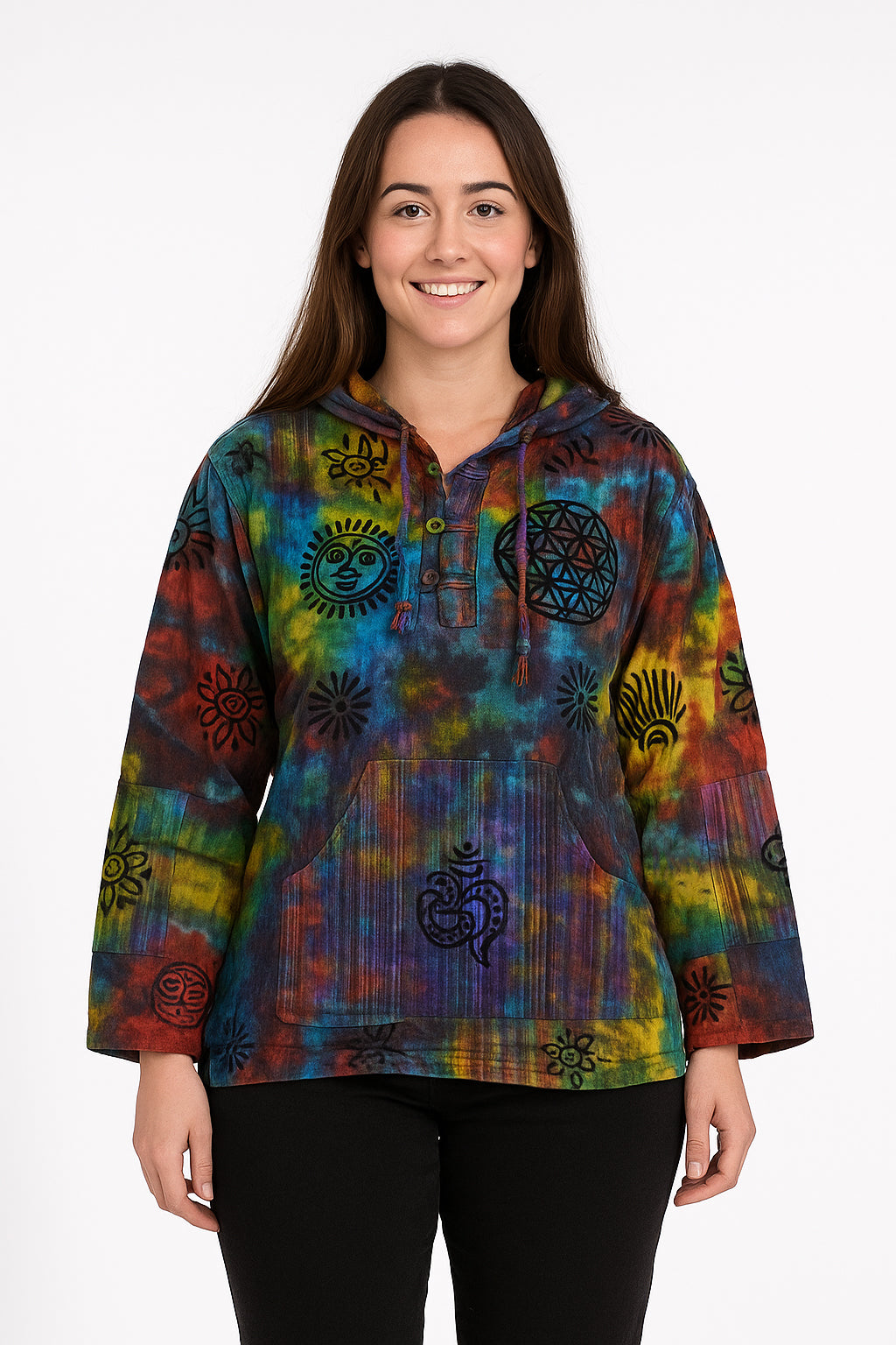 Add a touch of hippy spirit and comfort to your wardrobe with our Patchwork Printed Cotton Hoody. Made from striped patchwork cotton, each piece is hand-printed in Nepal with traditional motifs such as lotus flowers, endless knots, and circle-of-life sacred geometry designs. Each top has the same colours and print but placement may vary slightly to photos.