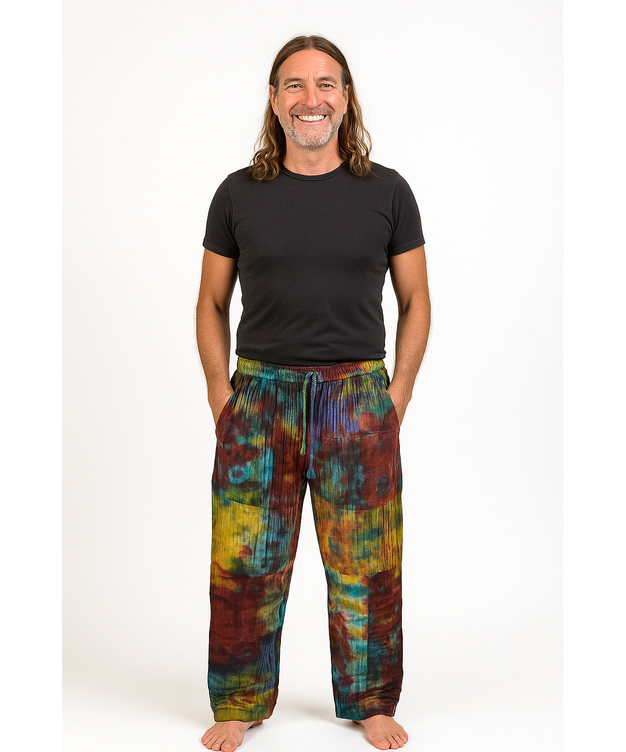 Made from 100% striped patchwork cotton, these trousers have been beautifully tie-dyed to create a vibrant, unique finish. The waistband is fully elasticated for comfort and includes a draw cord for an adjustable fit. There are handy pockets on both hips and one on the back. Designed with a straight leg and no ankle elastic, they’re relaxed, unisex, and perfect for everyday wear.
