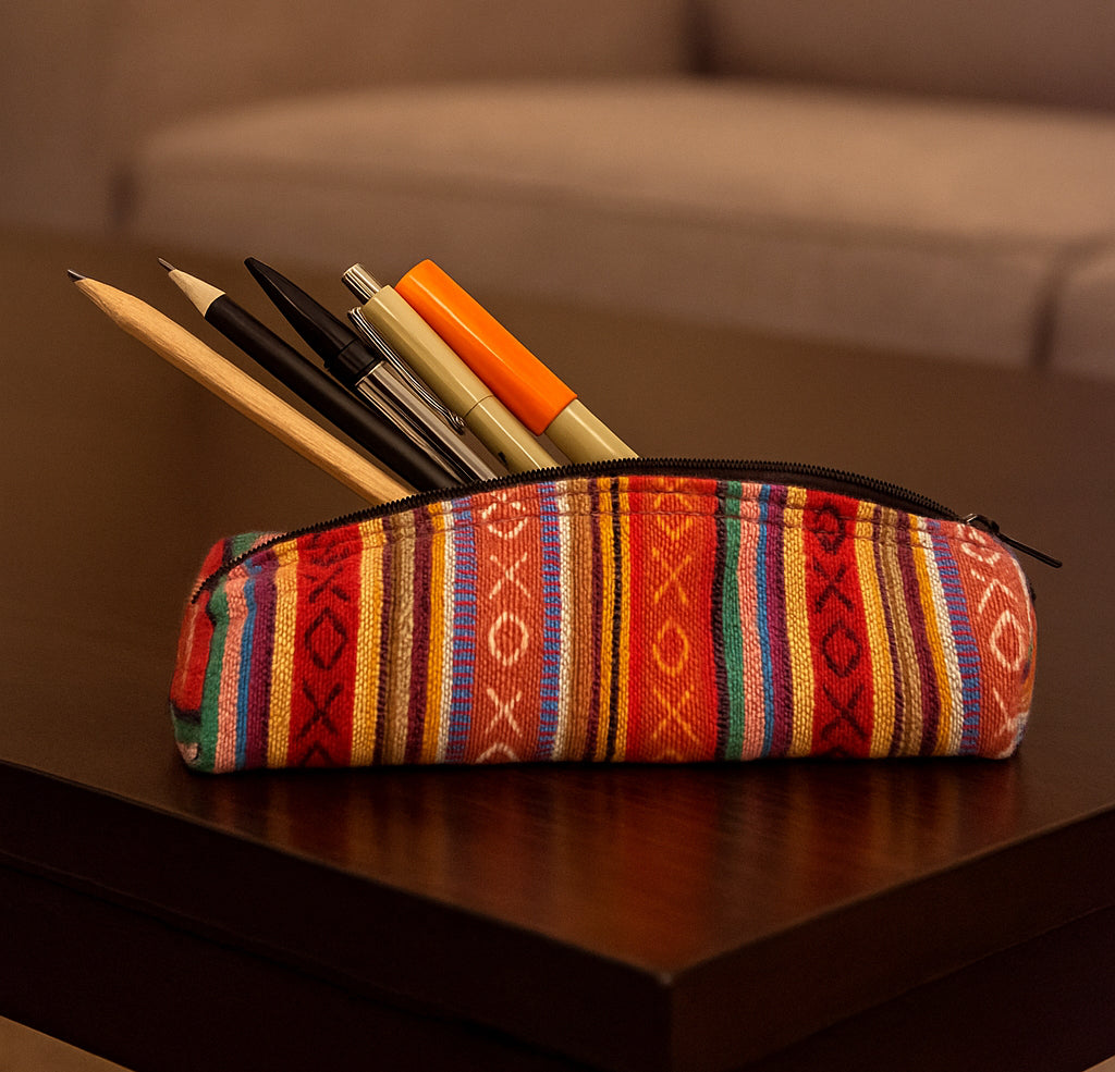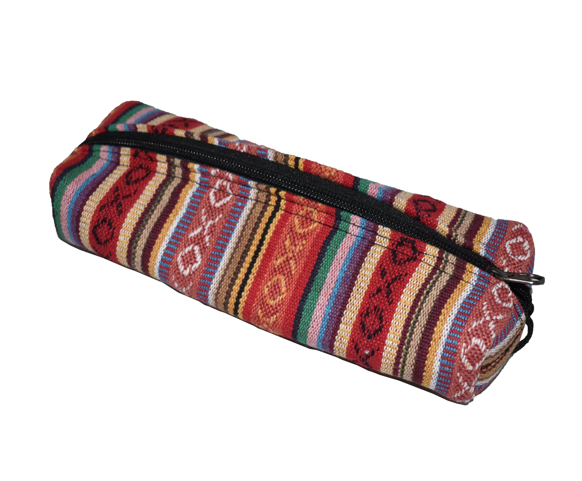 Brighten your day with these Fair Trade woven cotton pencil cases, handmade in Nepal with love and care. Lined with recycled protective foam to keep your treasures safe, each one closes with a strong zip and has a handy loop for clipping inside your bag. Planet-friendly, practical, and full of colour! Could also be used as a make up bag.
